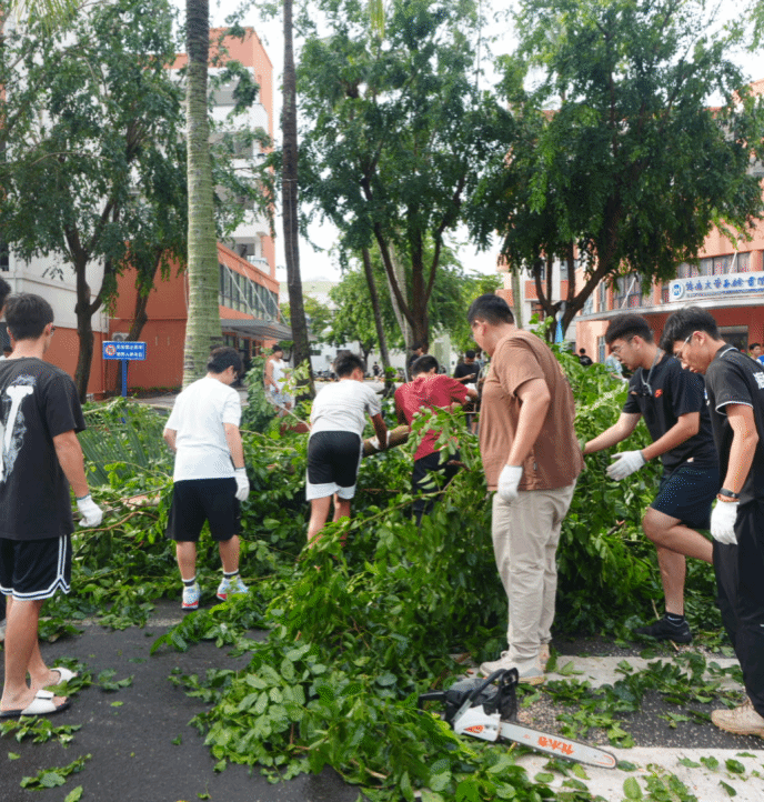 在4、5栋宿舍楼前,师生们分成多路行动:有人熟练地操作电锯切割粗壮的树干,有人齐心协力搬运成捆的枝叶,有人用扫帚清扫满地的狼藉。在5、6食堂侧面及主干道上,棕榈树和绿化带倒伏严重,大家不顾汗水湿透衣衫,徒手搬移障碍物,肩扛手抬地疏通道路。退伍大学生冲锋在前,学生干部有序协调,党员先锋队始终坚守在任务最繁重的区域。仅用数小时,三条关键通道便恢复了畅通,为全校师生的安全通行和正常复课筑牢了坚实的保障。