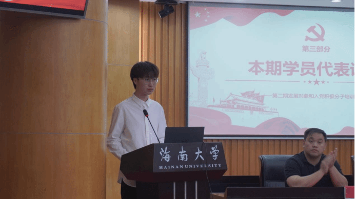 学员代表李金峰发言,表达了对入党学习的理解和入党决心。他表示,本次党课不仅仅是一场学习研讨,更是一次思想上的洗礼和党性修养的提升。作为党员发展对象,必须时刻牢记自己的职责和使命,以一名中国共产党党员的标准来要求自己,立志做有理想、敢担当、能吃苦、肯奋斗的新时代好青年。青年有理想,国家就有希望,民族就有力量。在学校和书院的带领、关怀和培养下,青年应以更加饱满的热情和更加实际的行动,投身到党组织的工作中,投身于建功自贸港,建功新时代的伟大实践中,不负党和人民的期望,为国家建设富强民主文明和谐美丽的社会主义现代化强国而努力奋斗。