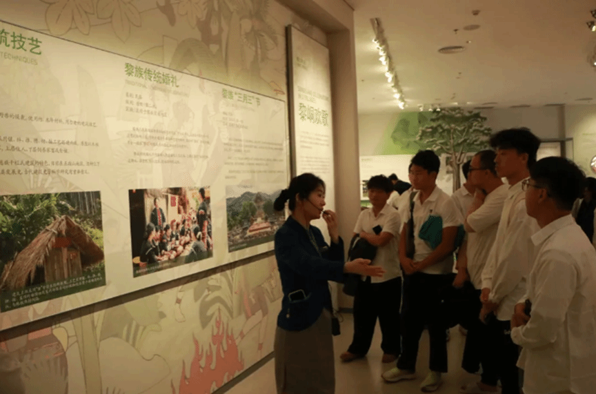 最后,团队前往非物质文化遗产展示区,体验黎锦、椰雕、船模等代表性的海南特色非遗项目。在专业导览员的引导下,师生们不仅亲身体验了这些传统技艺的制作过程,还深入了解了每项非遗背后的文化内涵,体会到海南传统文化的独特魅力与价值。
