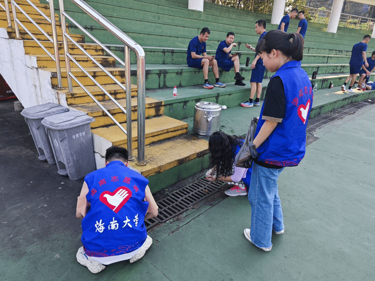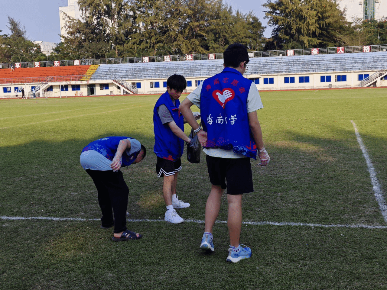 在会议结束后,同学们为践行雷锋精神,他们马上投入到校园清扫活动中去。身穿蓝色马甲的“雷锋”们带着劳动工具,前往第一田径场进行清扫。他们心中牢记雷锋精神,秉承着“为海大同学服务”的理念,为学校的美丽建设添砖加瓦。