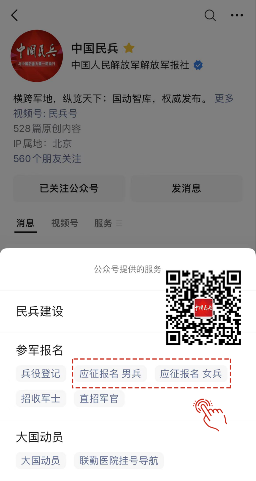 全国征兵网https://www.gfbzb.gov.cn/关注“中国民兵”微信公众号,识别二维码,进入全国征兵网报名。