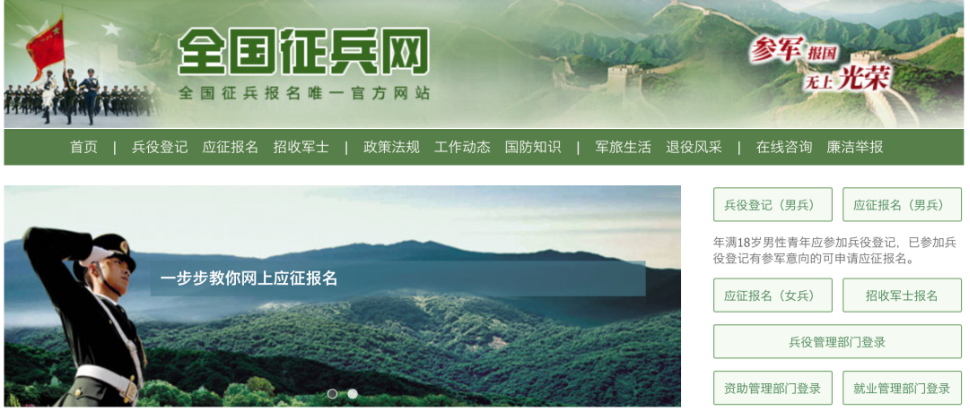 登录全国征兵网,点击“应征报名(男兵)”进入页面;男兵在应征报名之前,要先完成兵役登记。