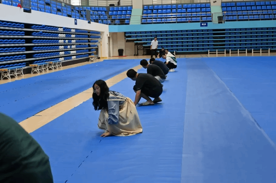 报到接待组志愿者组织签到并引导参会人员入场,领队会议组志愿者组织开展抽签活动,裁判组志愿者布置赛道,会场会务组志愿者通过广播发布通知、进行会场管理。