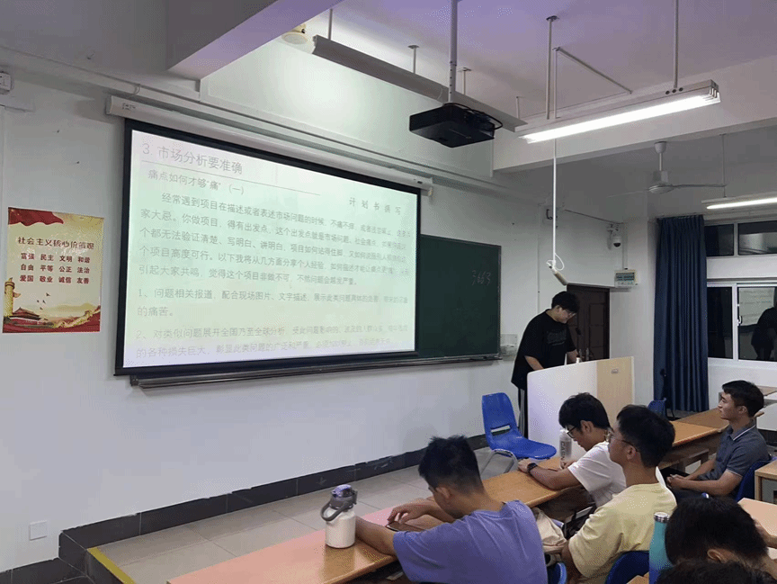 活动内容围绕创新创业的核心环节展开。吴昆玮首先分享了团队搭建的经验,强调了人员招募的动态流出机制和团队运营的定期组会、模拟答辩等策略。接着,他详细讲解了计划书撰写的关键点,包括执行概要的提炼、市场分析的精准性以及产品介绍的核心价值。在PPT设计与改良部分,他提出了逻辑结构、文字内容、图片图表和排版的具体建议。此外,他还结合自身路演经历,分享了路演备赛的技巧和答辩环节的注意事项,为同学们提供了从备赛到实战的全面指导。